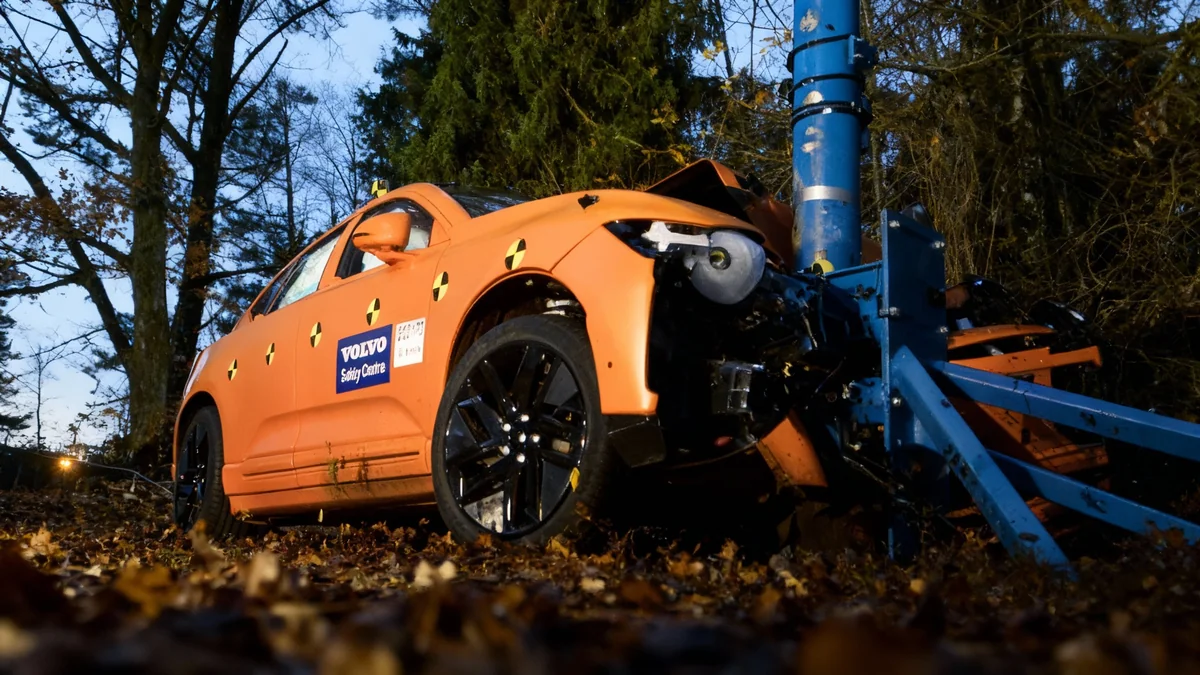 Volvo hat seinen neuen Elektro-SUV EX60 einem strengen internen Crashtest unterzogen. Das Fahrzeug prallte mit 60 km/h gegen einen Pfahl, um einen Baumunfall zu simulieren.